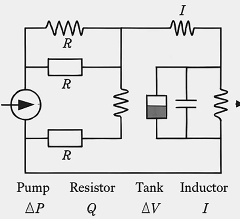 Burada akışkanlar mekaniği ile elektrik devre analojisini gösteren diyagramı görebiliriz: solda pompa (basınç kaynağı ↔ voltaj kaynağı), ortada seri ve paralel borular (hidrolik direnç ↔ elektriksel direnç), yan kolda tank/rezervuar (hidrolik kapasitans ↔ kapasitör), akışın ataleti (hidrolik inertans ↔ indüktör) ve sağda çıkış debisi ↔ akım.