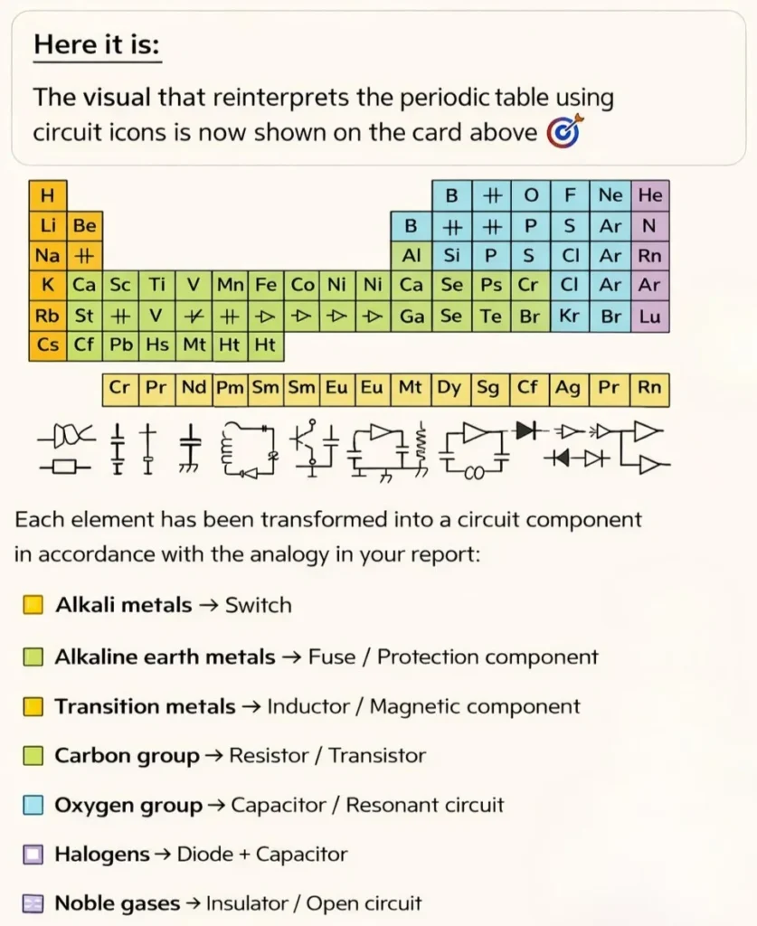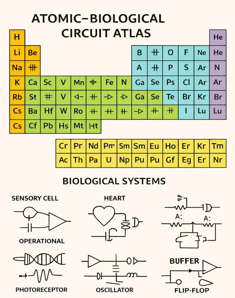The Atomic-Biological Circuit Atlas offers an interdisciplinary modeling framework that combines chemistry, physics, and biology with a common circuit language. Both the periodic table and biological systems can be represented using circuit elements, creating a visual and computational simulation platform.