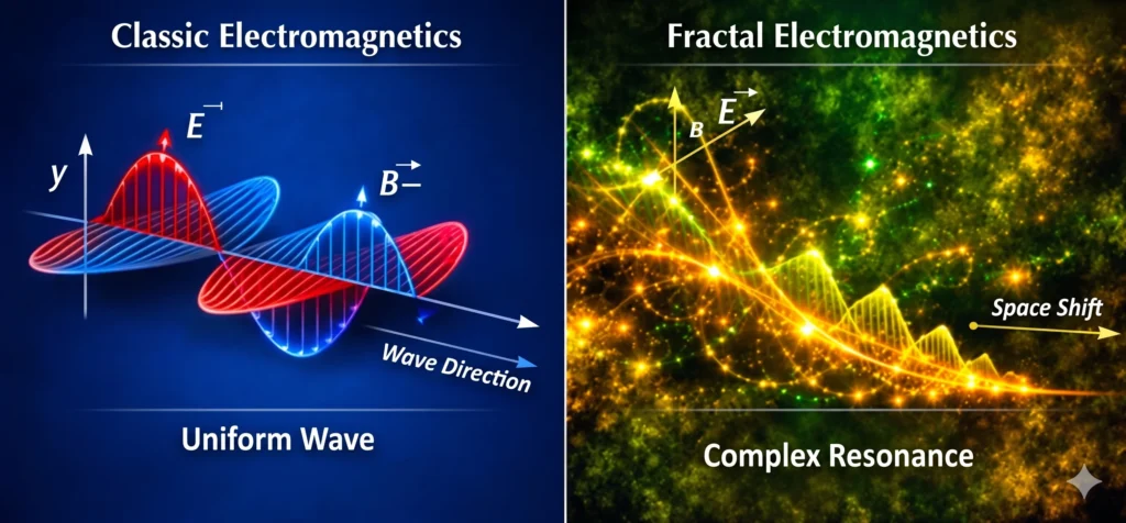 - Fractal Electromagnetic (right): Branched, multi-scale wave structure. Field lines connect to form motif-repeating resonance networks. Energy is no longer unidirectional, but in circulation across scales.