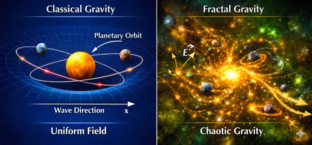 - Fractal Gravitation (right): The fabric of space-time is no longer smooth; it is multi-scale, wavy, and resonant. Mass attraction branches out at micro- and macro-scales, creating fractal gravitational networks. Energy flow is not unidirectional, but multi-directional and dynamic.