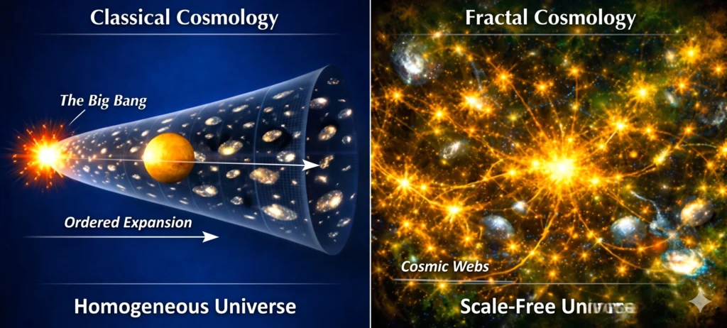 - Fractal Cosmology (right): The structure of the universe is no longer homogeneous; it is multi-scale, dynamic, and self-similar. Galaxies connect to each other in the form of cosmic webs and filaments β an inter-scale pattern emerges.