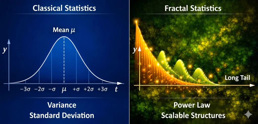 - Fractal Statistics (right): Power-law distribution, long-tailed, and motif-repeating structures across scales. The mean alone is not sufficient; the tails show the complex nature of the system.
