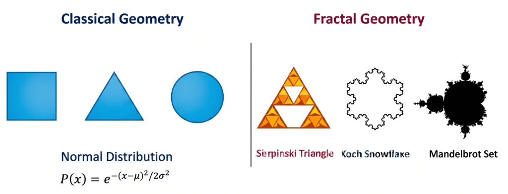 This visual clearly presents the classical approach that tries to explain nature with a single-scale “mean” versus the fractal approach that captures the complex, multi-scale distributions in nature.