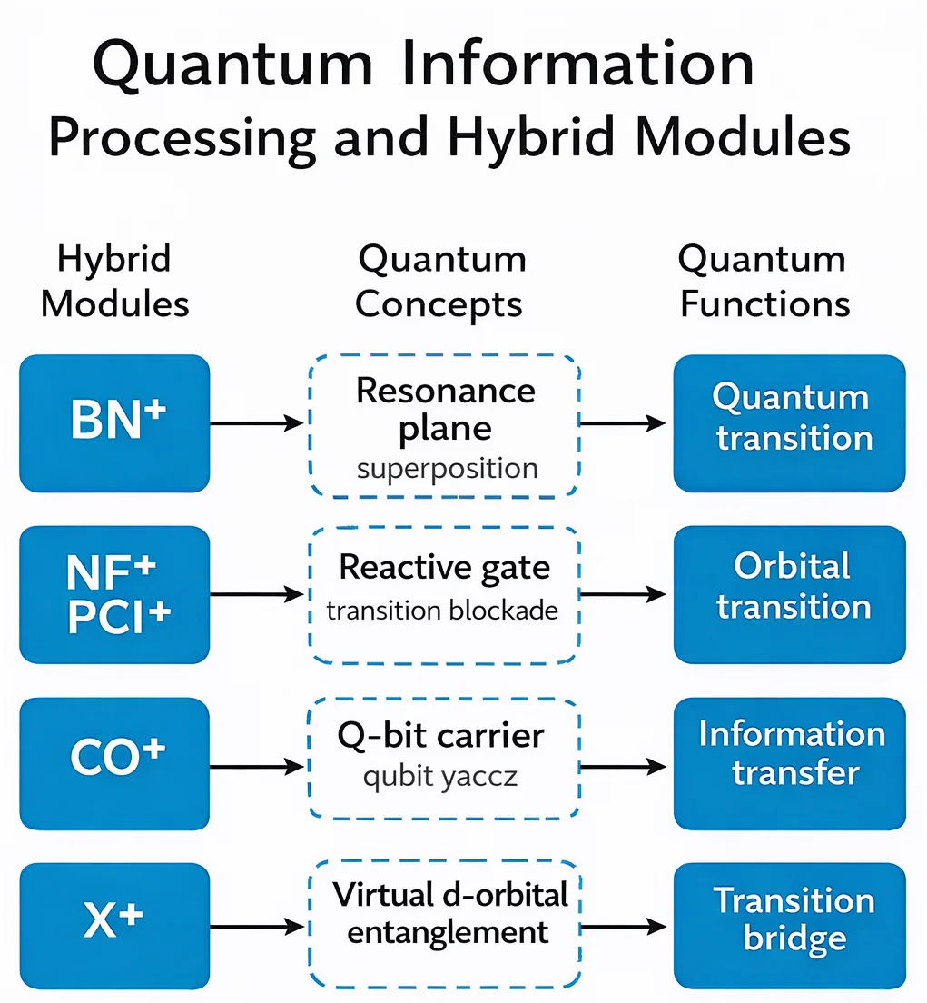 This structure clarifies how hybrid modules directly translate into quantum functions such as q-bit architecture, superposition, entanglement, and circuit switching.