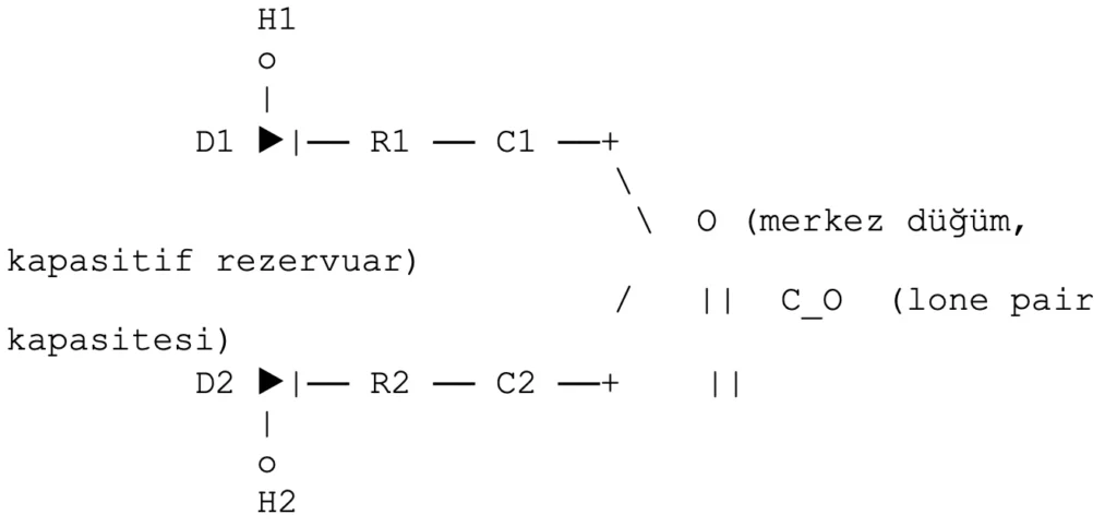 - Kapasitif rezervuar: O’nun lone pair’leri 𝐶0 ile temsil edilir; suyun yüksek dielektrik sabiti ve polaritesini devrede yükseltilmiş depolama olarak yansıtır.