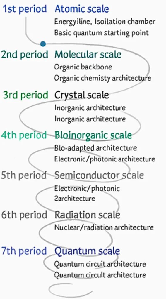 | 7. Periyot | Kuantum ölçek | Enerji hattı (Fr), kolon (Ra), kapı (Ts), oda (Og) + Np–Am–Cm kuantum üçlüsü | Kuantum devre mimarisi | 6. periyodun kuantum bilgi ölçeğine taşınması |