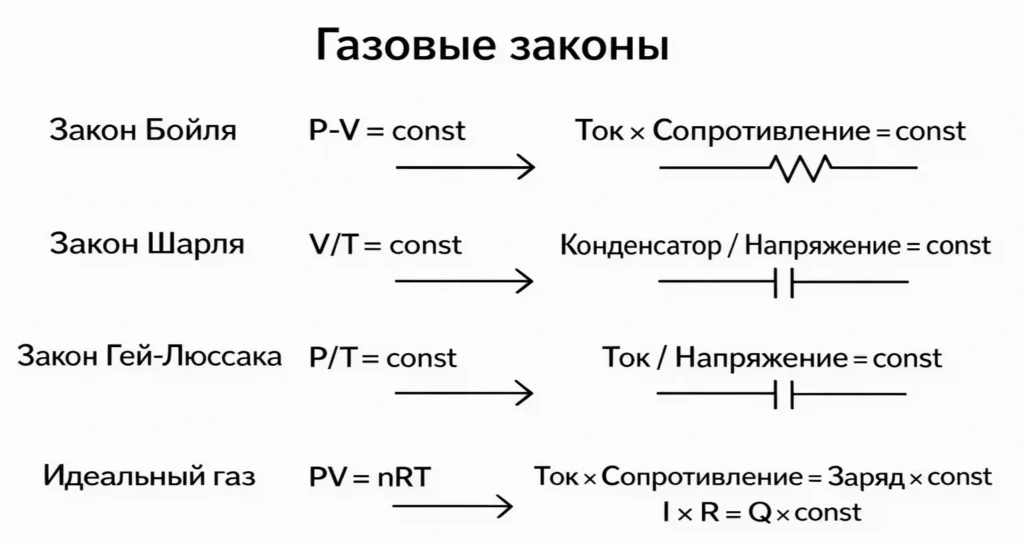 | Уравнение состояния идеального газа (PV = nRT) | Давление × Объём = nRT | Ток × Сопротивление = заряд × постоянная | Параметры электрической схемы определяют макроскопическое поведение газа. |