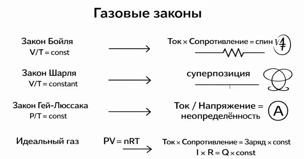 | Закон Гей-Люссака (P/T = постоянная) | Давление / Температура | Ток / Напряжение = постоянная | Увеличение напряжения повышает ток; увеличение температуры повышает давление. |