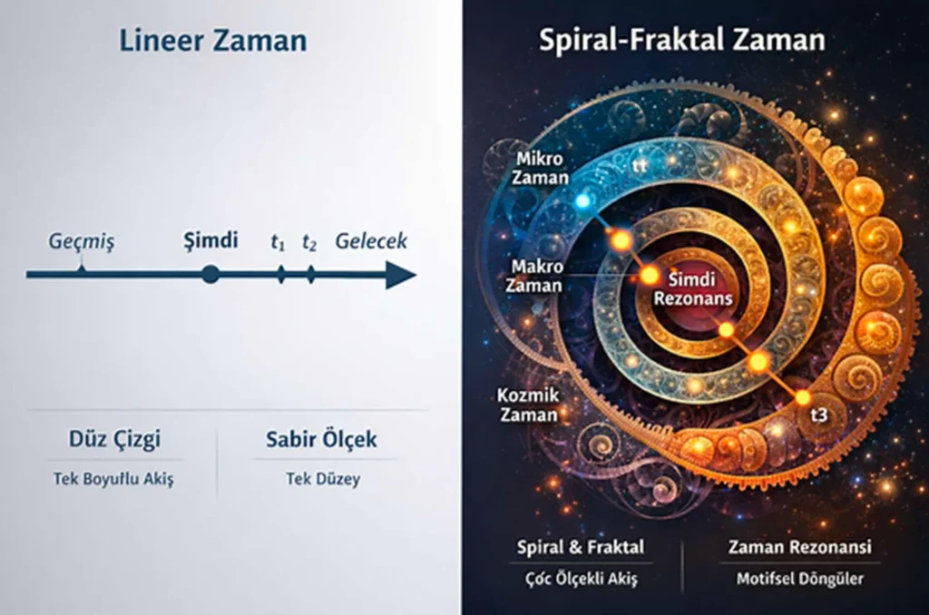 • “Şimdi” kavramı lineer modelde tek bir nokta iken, spiral–fraktal modelde “Şimdi Rezonansı” çok katmanlı bir merkez olarak tanımlanıyor.