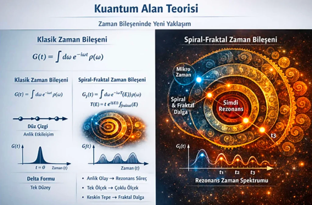 • Kuantum Alan Teorisi: Propagatörlerin zaman bileşenini spiral–fraktal fonksiyonla yeniden tanımlamak.