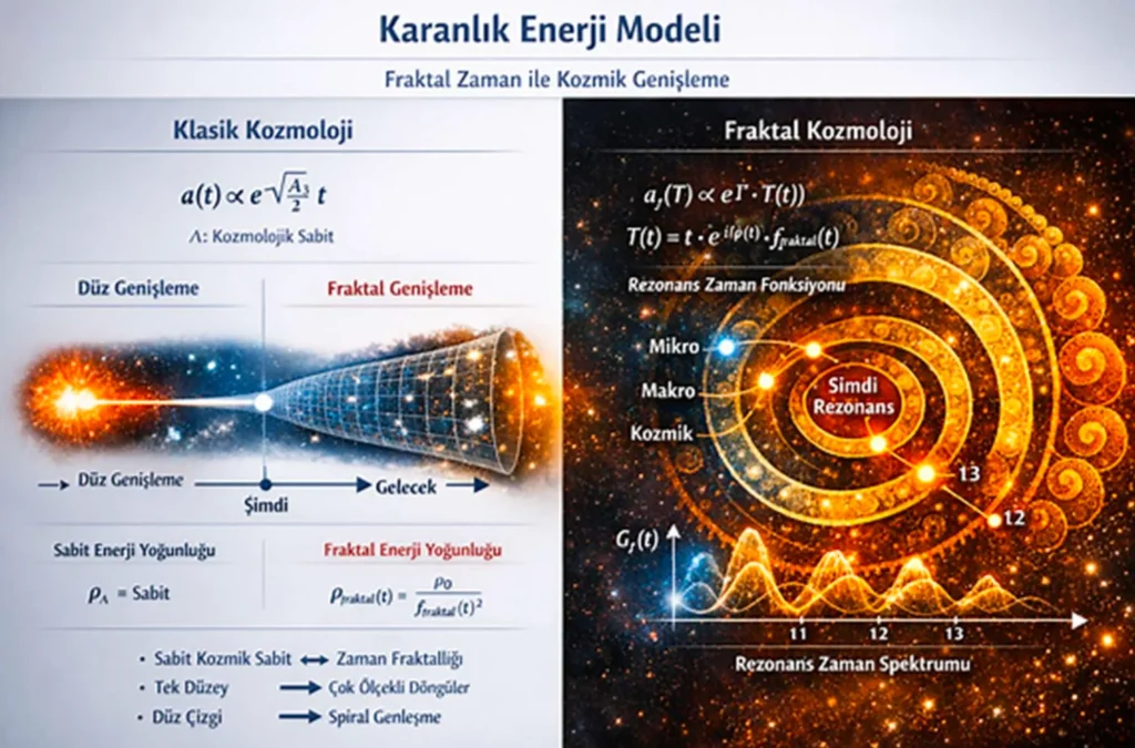 Bu yaklaşım, karanlık enerjiyi “zamanın kendi iç fraktal yapısının sonucu” olarak yorumlar. Yani evrenin hızlanan genişlemesi, sabit bir kuvvetten değil, zamanın spiral–fraktal ölçeklerde genişlemesinden kaynaklanıyor.