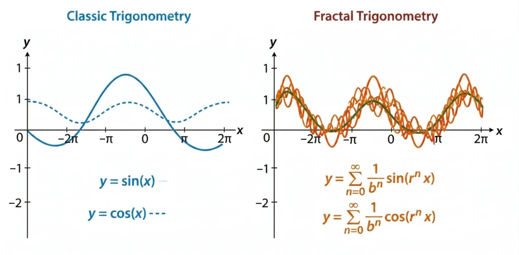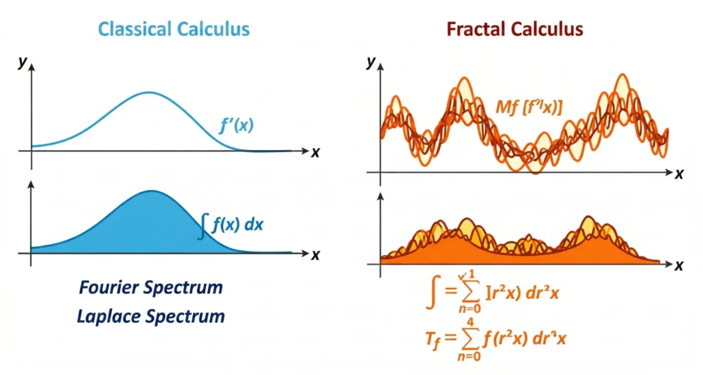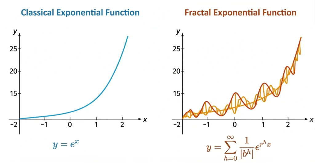 准备好!在这张图像中,经典指数函数 𝑦 = 𝑒x 与分形指数函数 𝑦 = ∑(1/𝑏n)𝑒r^n x 被并排展示。左侧的经典曲线呈现平滑、单尺度的上升;而右侧的分形曲线则呈现带有基序重复波动的多尺度上升。