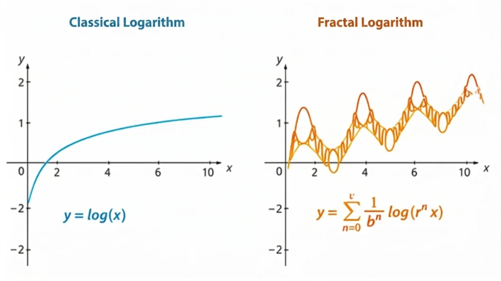 在图像中你可以并排看到经典对数和分形对数:左边是单尺度的、平滑上升的经典曲线;右边则是基序重复的、多尺度的波浪状分形对数。