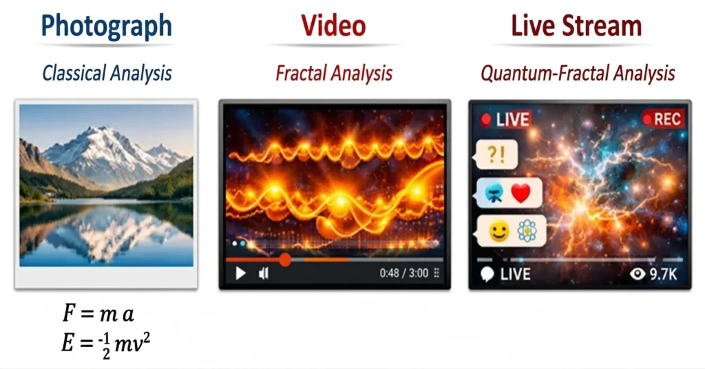 经典分析将自然视为瞬间的截面;它通过固定参数、静态方程和单一尺度的过程拍摄自然的“照片”。而分形分析则在过程之中、通过尺度间的相互作用、共振和反馈循环来审视自然——也就是拍摄自然的“视频”。