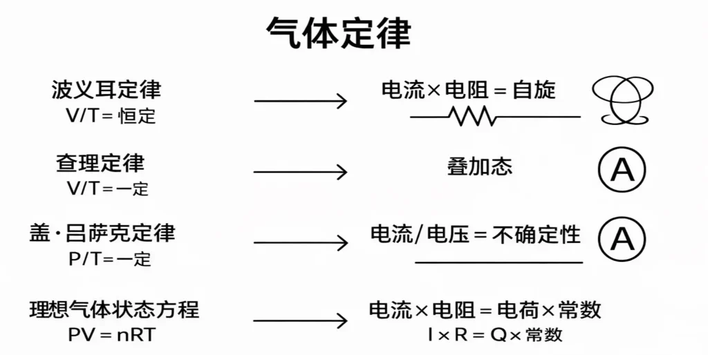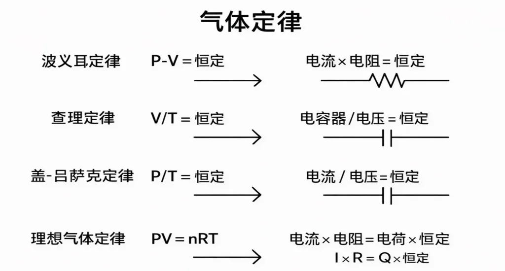 | 理想气体定律(PV = nRT) | 压力 × 体积 = nRT | 电流 × 电阻 = 电荷 × 常数 | 电路参数决定气体的宏观行为。 |