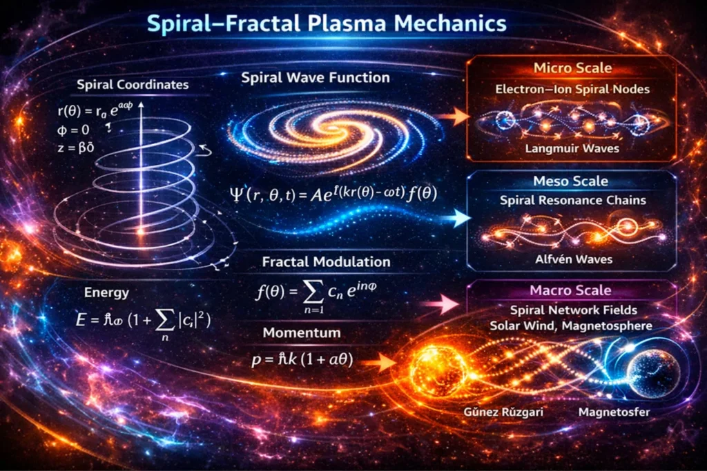 等离子体波(朗缪尔波、阿尔芬波、磁波)不以线性方式建模,而是以螺旋–分形结构建模。