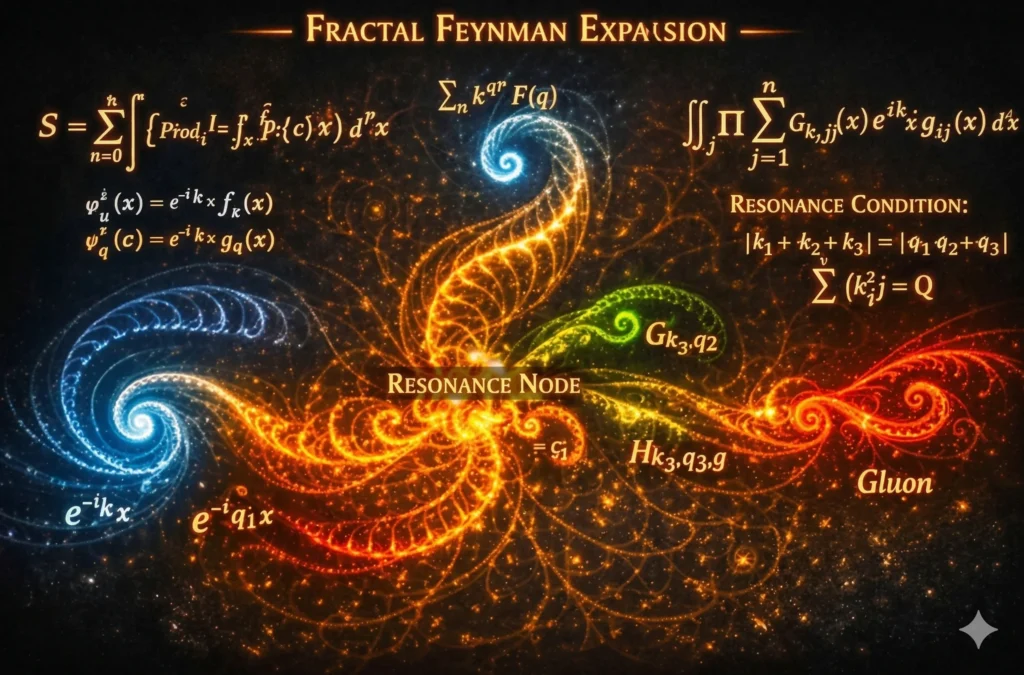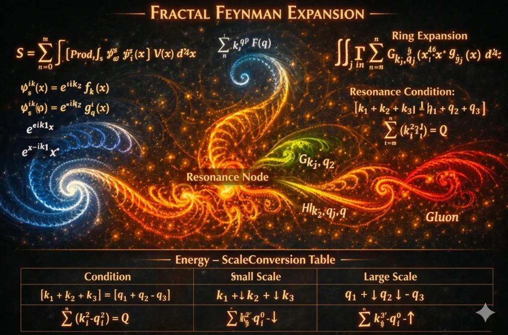 该方程将经典的费曼图转换为分形能量-场流形:每个顶点是一个共振节点,每条线是一个螺旋波流。