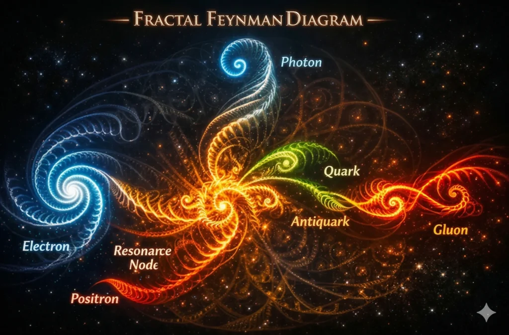 这种方法将费曼图可视化为多尺度分形共振网络的能量转移,而不仅仅是线条和节点。